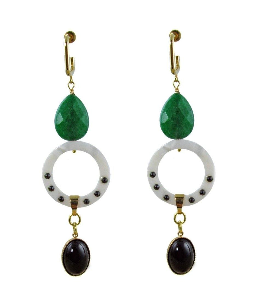 DETAILS: Agate faceted stone, Mother of pearl ring, gemstone pendant, Swarovski cabochons, Gold plated earring post COLOURS: Green, White, Gold, Bl...