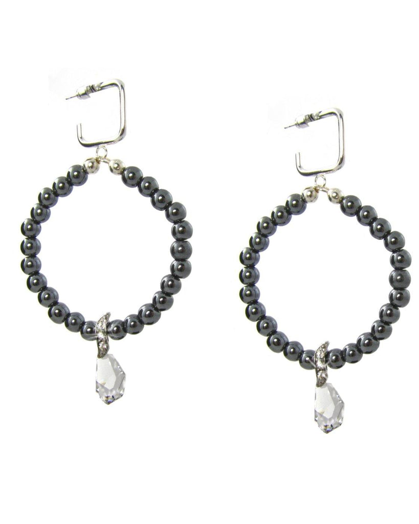 DETAILS: Hematite, Swarovski Crystals, Silver plated earring posts COLOURS: Grey, Clear, Silver DROP OF EARRING: 8cm DIAMETER: 4.5cm