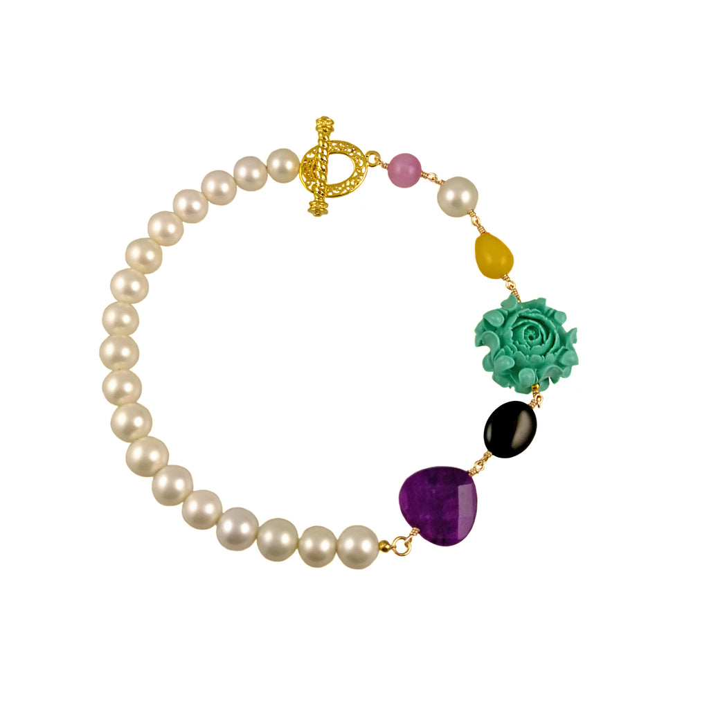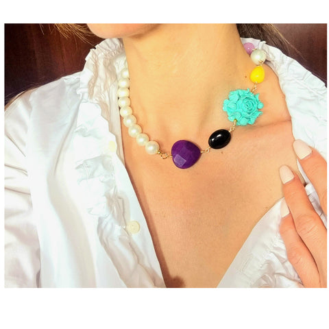 DETAILS Shell pearls 12mm, White Jade faceted heart shape stone, mauve Oval Onyx stone, black Synthetic coral flower 30mm Agate drop, yellow Filig...