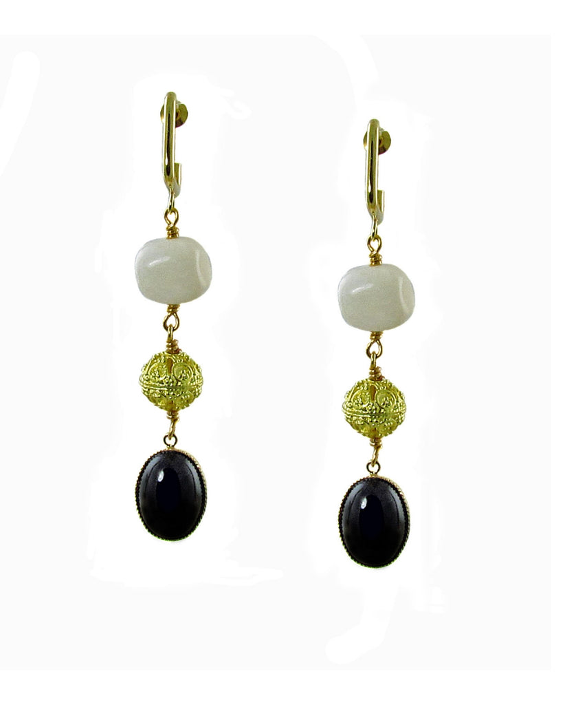 DETAILS: Onyx flatback, brass filigree beads, Gold plated earring posts COLOURS: Cream, Black, Gold Drop of Earrings: 8cm